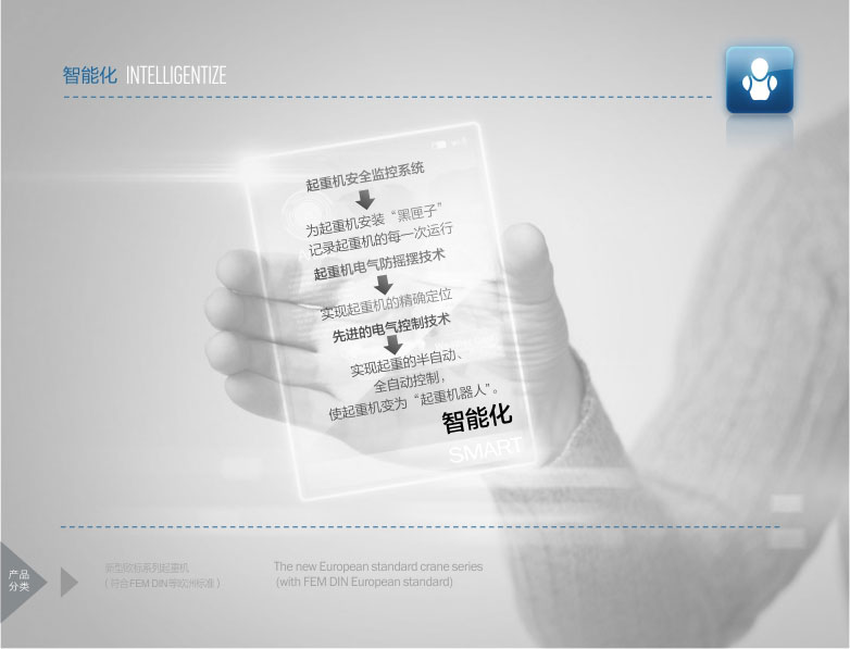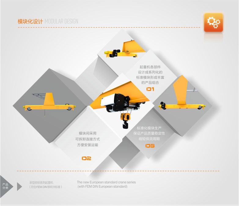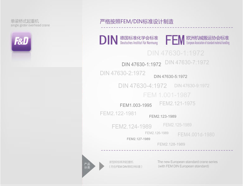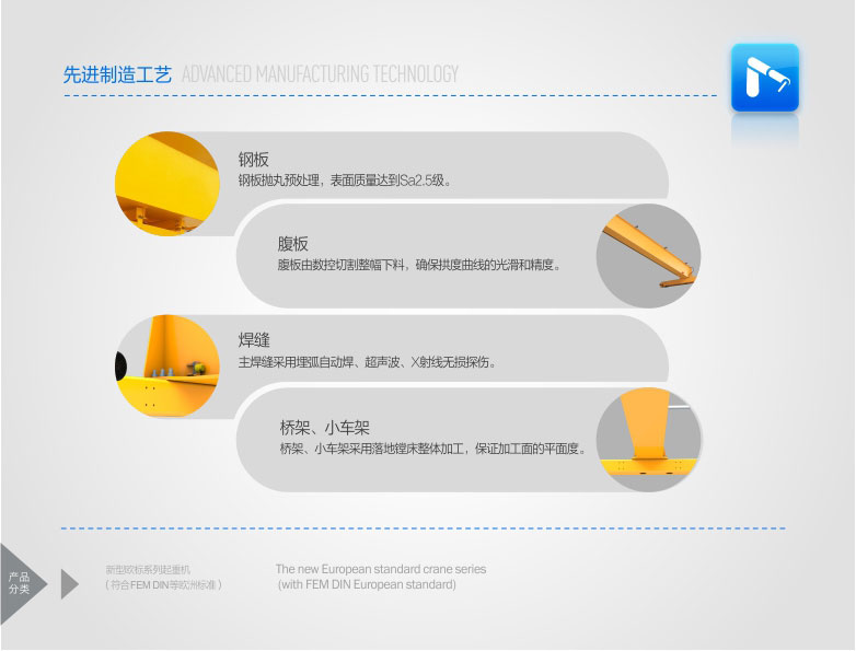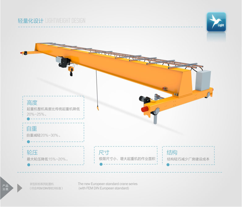 2、   該產(chǎn)品技術(shù)先進,設計按照國際標準:DIN(德國)、FEM(歐洲)、ISO(國際),具有剛性強、自重輕、結(jié)構(gòu)設計出眾等優(yōu)點,能有效地節(jié)約廠房空間和投資成本,行走結(jié)構(gòu)特點獨特。