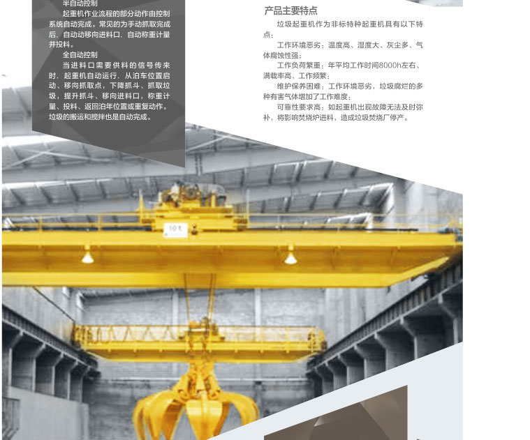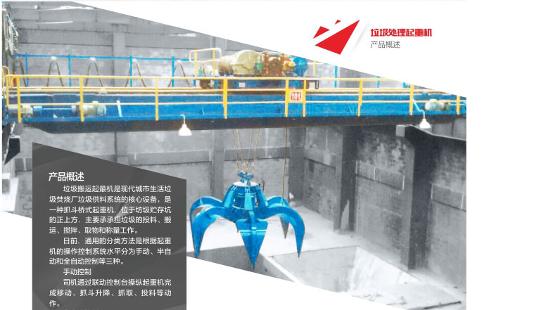 1、 垃圾抓斗起重機(jī)是現(xiàn)代城市各種垃圾焚燒發(fā)電廠垃圾供料系統(tǒng)的核心設(shè)備,位于垃圾儲存坑的上方,主要承擔(dān)對垃圾的投料、搬運(yùn)、攪拌、取物和稱重等作業(yè)。